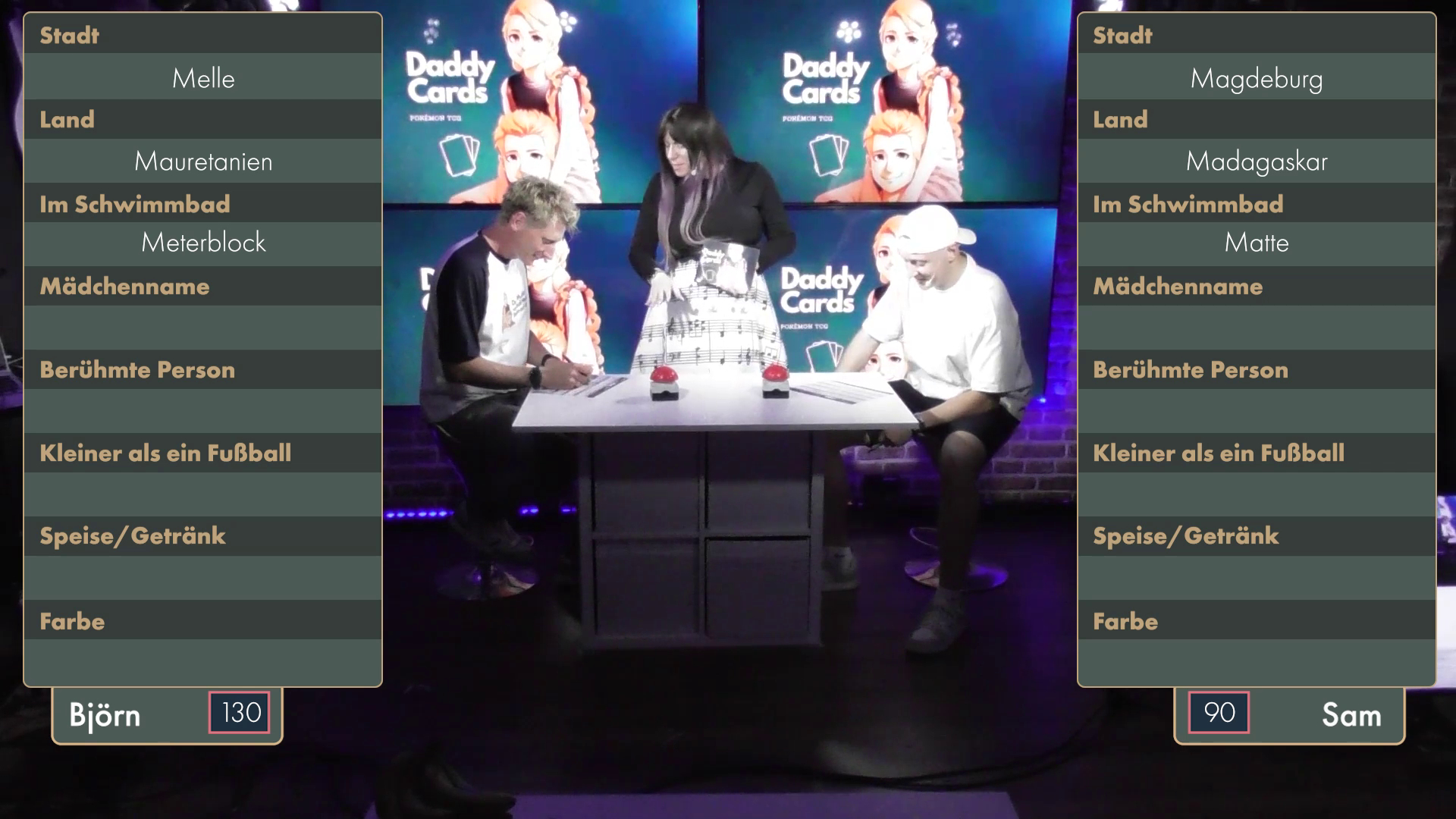 Ein absolutes Highlight des Events war die Extended-Version von „Schlag den Daddy“. In dieser Ausgabe trat Daddy Cards höchstpersönlich gegen Sam von Lama Cards an – ein episches Duell moderiert von Aileen, die als Quizmasterin den beiden ordentlich einheizte. Die Zuschauer fieberten live mit und konnten das Spektakel sowohl im Stream als auch im Chat aktiv begleiten.