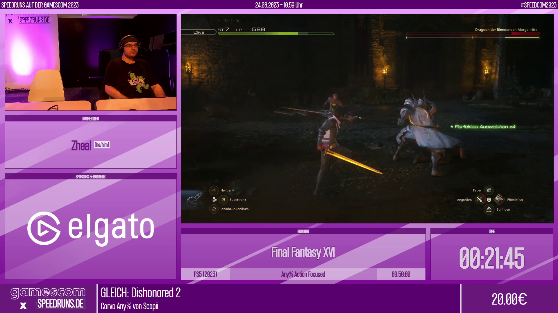 - Final Fantasy XVI (Stream Exclusive) – Der Donnerstag stand ganz im Zeichen von Final Fantasy. Der extra eingeflogene Runner Zheal spielte den neuesten Teil der Reihe in einem spektakulären Run von über 9 Stunden – ein Stream-Exklusiv, da die Halle an diesem Tag noch nicht für Publikum geöffnet war.