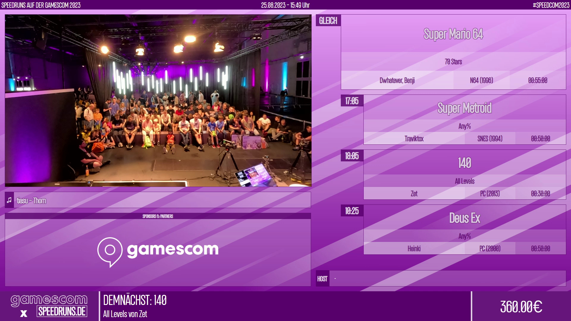 - Super Mario 64 (70 Stars) – Head-to-Head Race – Ein spannendes Rennen zwischen den beiden besten deutschsprachigen Runnern Benji und Dwhatever, kommentiert von der Top-Runnerin Eleesuh. Der Zuschauerbereich war derart überfüllt, dass Fans sogar zwischen den Sitzplätzen und um die gesamte Bühne herum saßen und standen.
