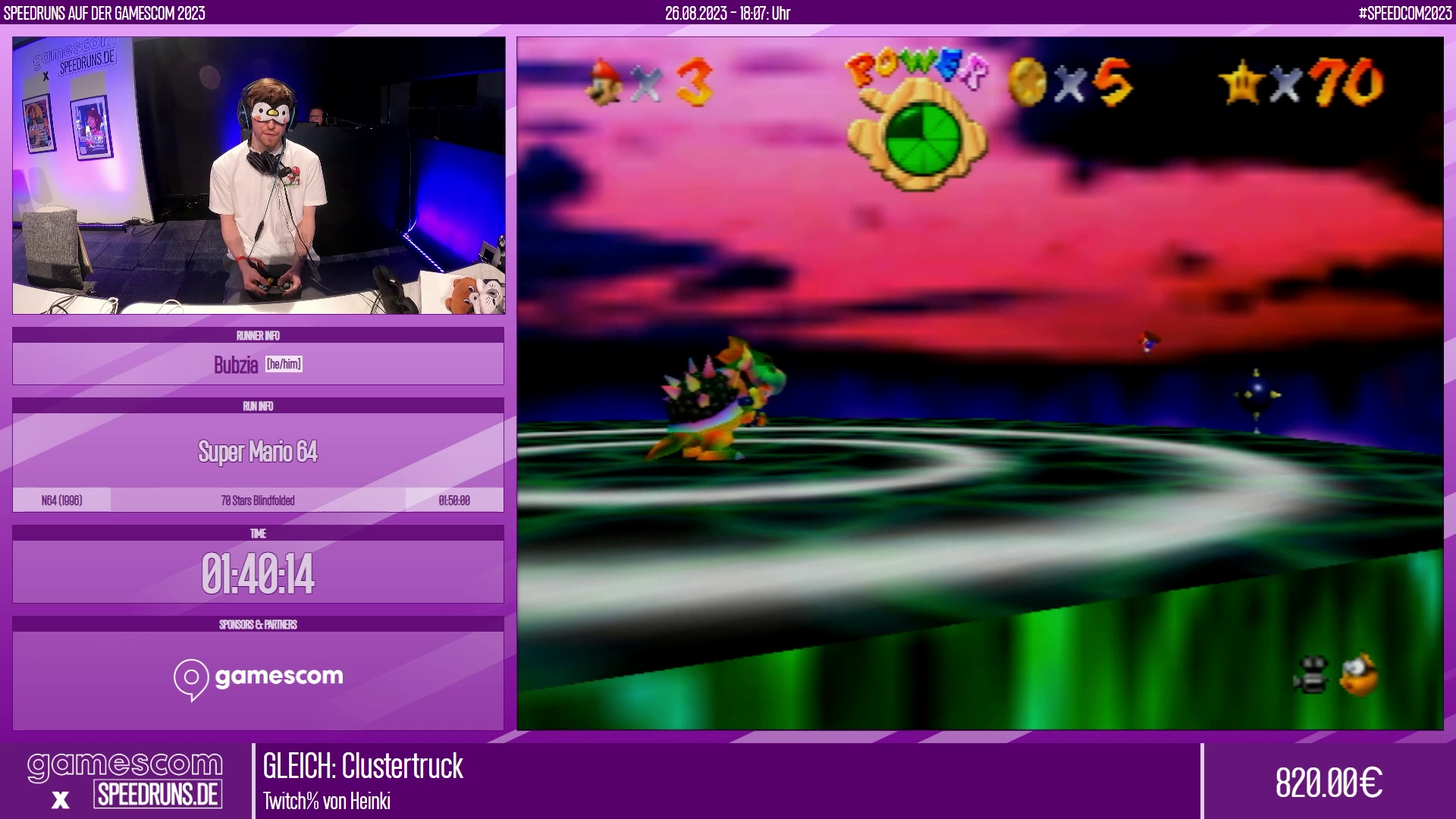 - Super Mario 64 (70 Stars Blindfolded) – Gezeigt von Bubzia, dem Guinness World Record-Halter für Blindfolded-Runs. Zuschauer konnten live im Stream abstimmen, welche Maske für den Run verwendet wird.